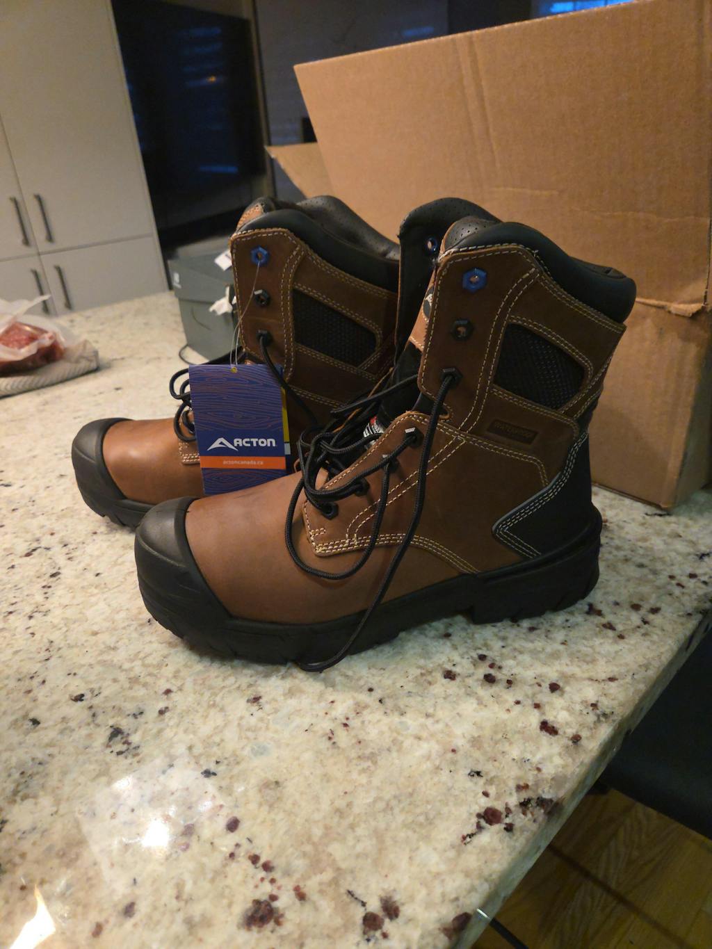 8" leather work boot, extra-wide fit, with breathable waterproof membrane, 200 g insulation, mesh fabric lining, composite toe cap and protective sole. Discover the performance of its dual density non-slip 4Grip sole in natural rubber with a PU core.